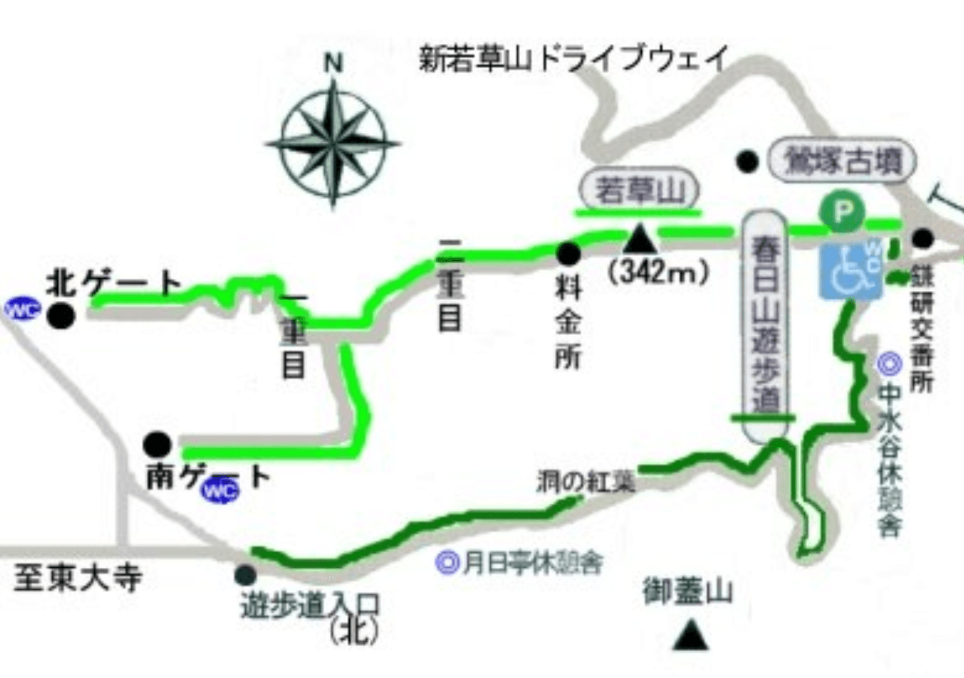 北側入山ゲート〜若草山三重目山頂〜(下り)春日遊歩道〜南側ゲートor春日大社を目指す登山コースMAP