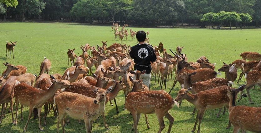 奈良鹿愛護会の職員の方が来場し、ホルンを吹いてヤバぃよ素敵に鹿たちを呼び寄せる。